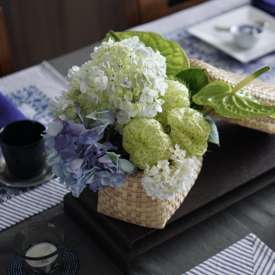 テーブルの中央には、錆鉄台座長角600と長角520をアシンメトリーに重ね、その上にテーブルフラワーをあしらいました。選んだのは、紫陽花と、ふっくらとした丸みが愛らしいフウセントウワタ、そして艶やかな質感が印象的なアンスリウム。個性豊かな花々を、涼やかに調和させてくれたのが、南インドの伝統工芸品、Kottai(コッタン)のバスケットです。