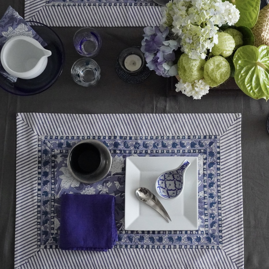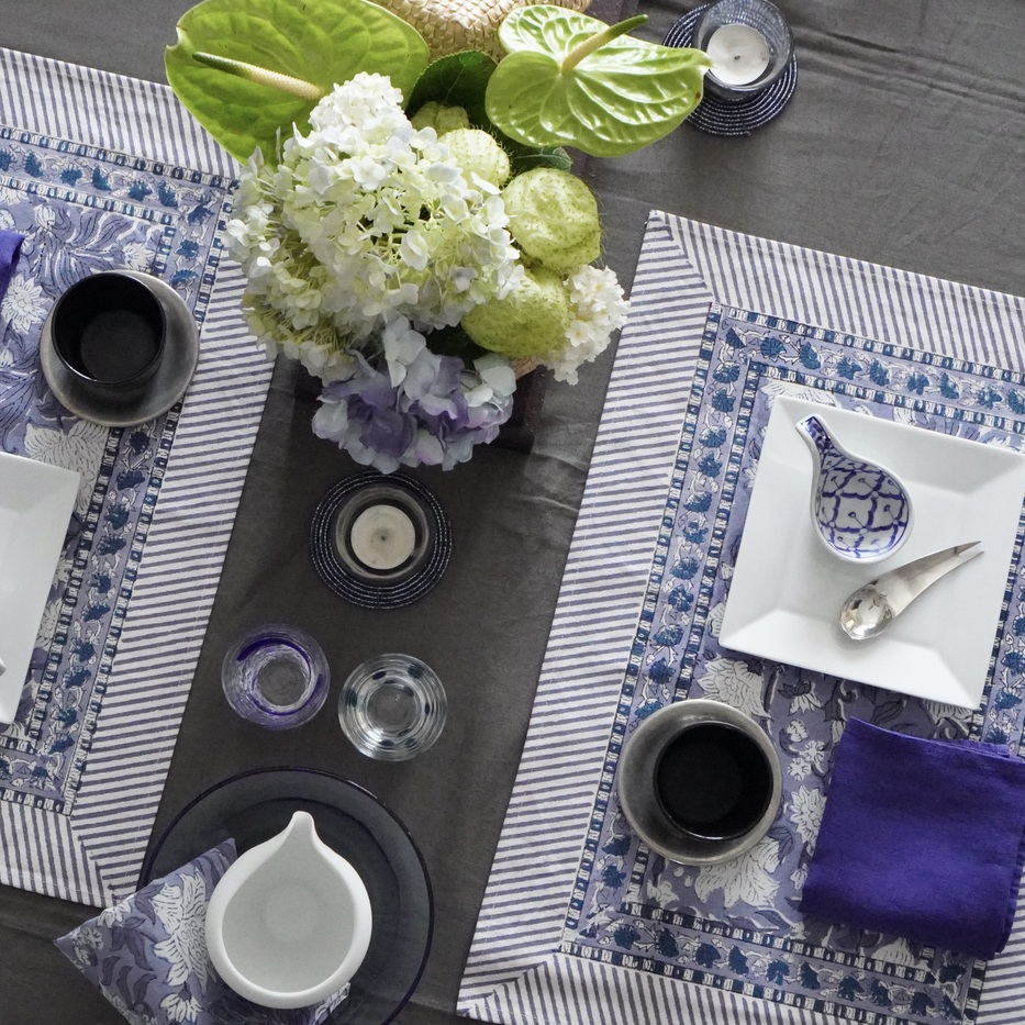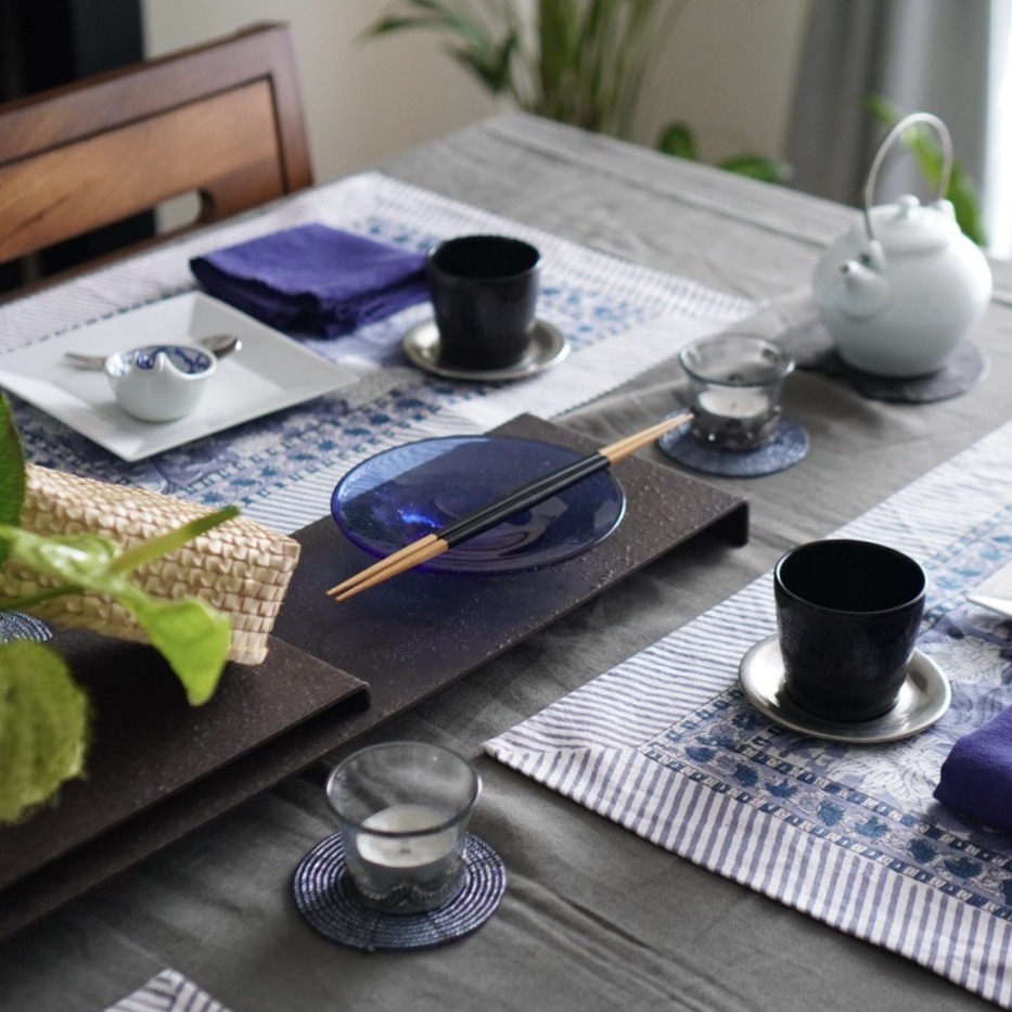 温かいお茶と冷たいお茶を和菓子とともにゆっくりと楽しむ――そんな穏やかな夕べをイメージして、テーブルコーディネートしました。選んだのは、ブルーを基調にしたインド更紗のランチョンマット。