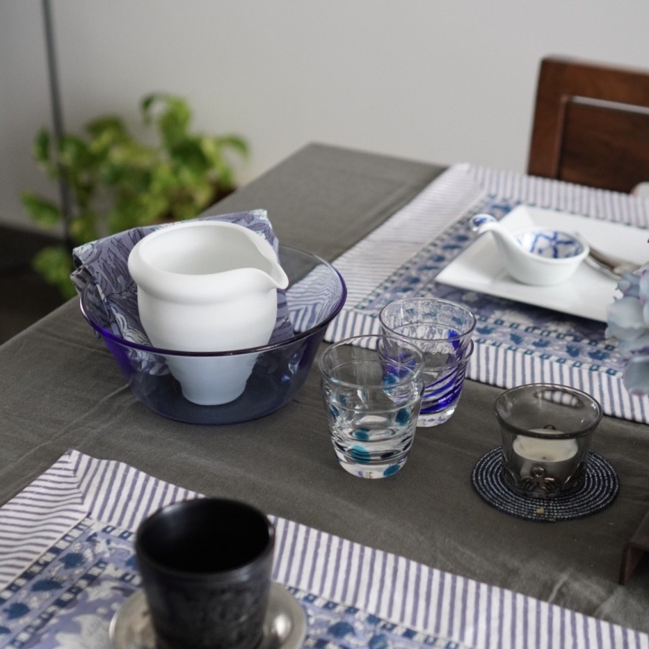 今回セレクトしたのは、ブルーを基調とした涼感ある柄。その軽やかなテキスタイルが、夏の夕暮れの光と調和し、テーブル全体に凛とした清涼感を添えてくれました。