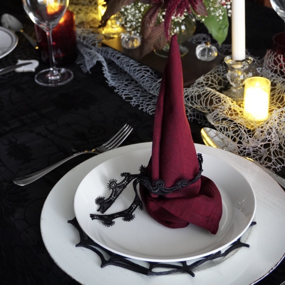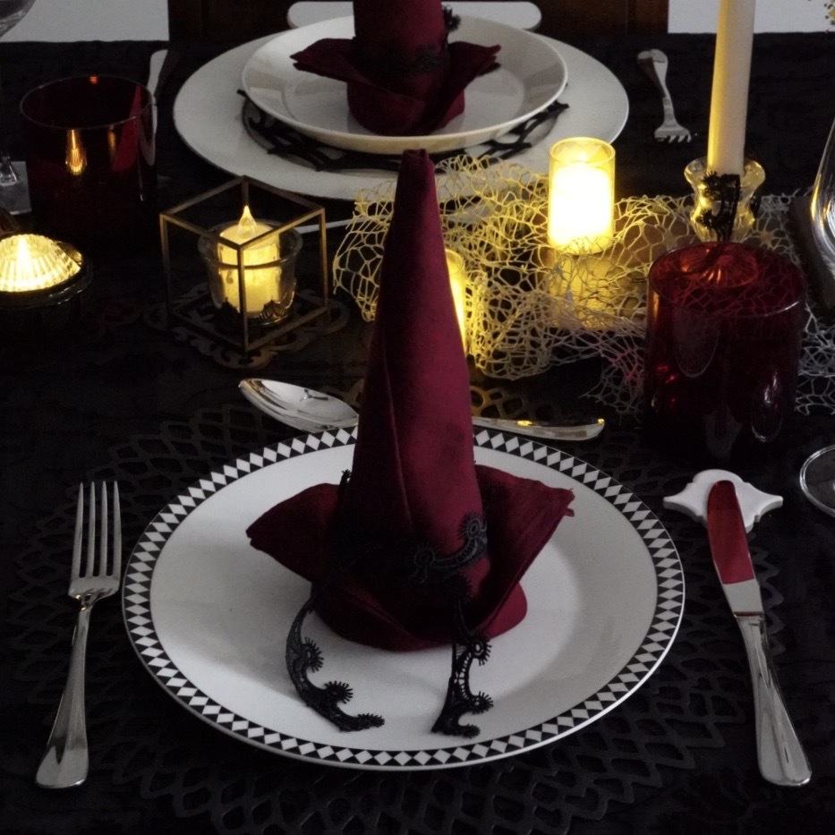 ナプキンは魔女の帽子をイメージして折り、インドの黒いレースのリボンで結びました。布の陰影がつくり出すラインは、どこか魔法の儀式を思わせるよう。ナイフレストには岐阜県多治見市のタイルミュージアムで見つけた小さなタイルを。小さな遊び心と旅の思い出がテーブルに軽やかさを加え、大人のハロウィンにふさわしい余韻をもたらします。