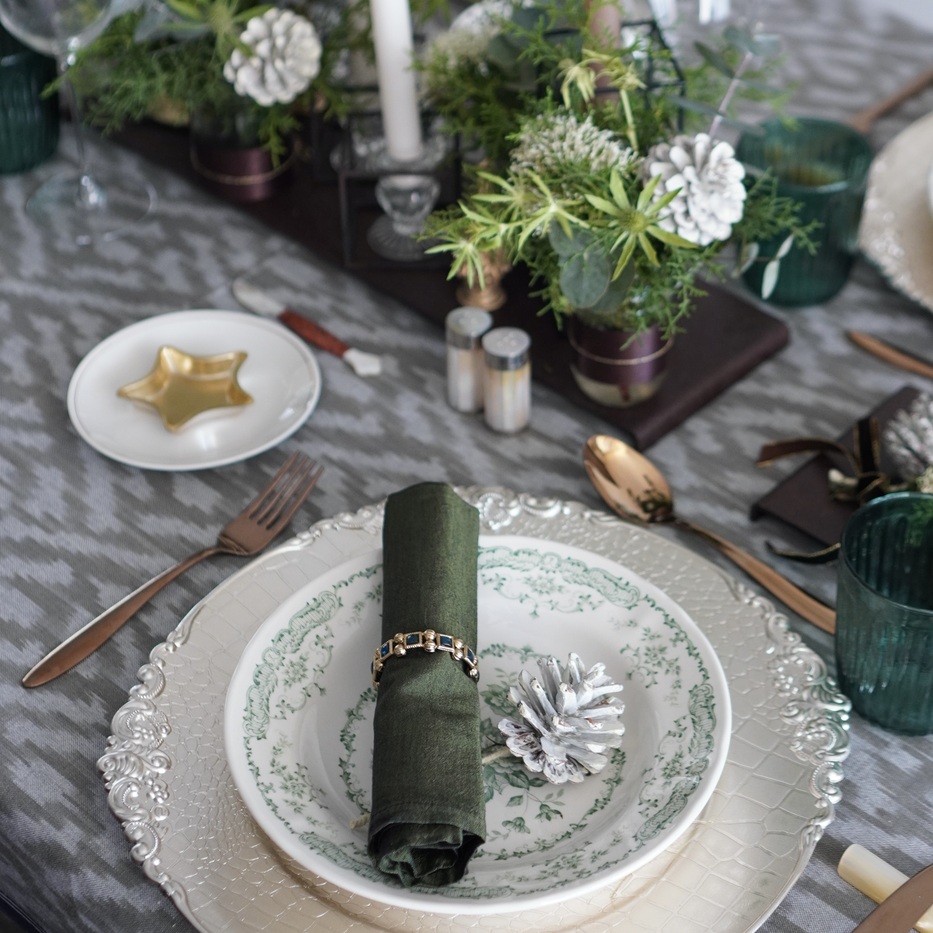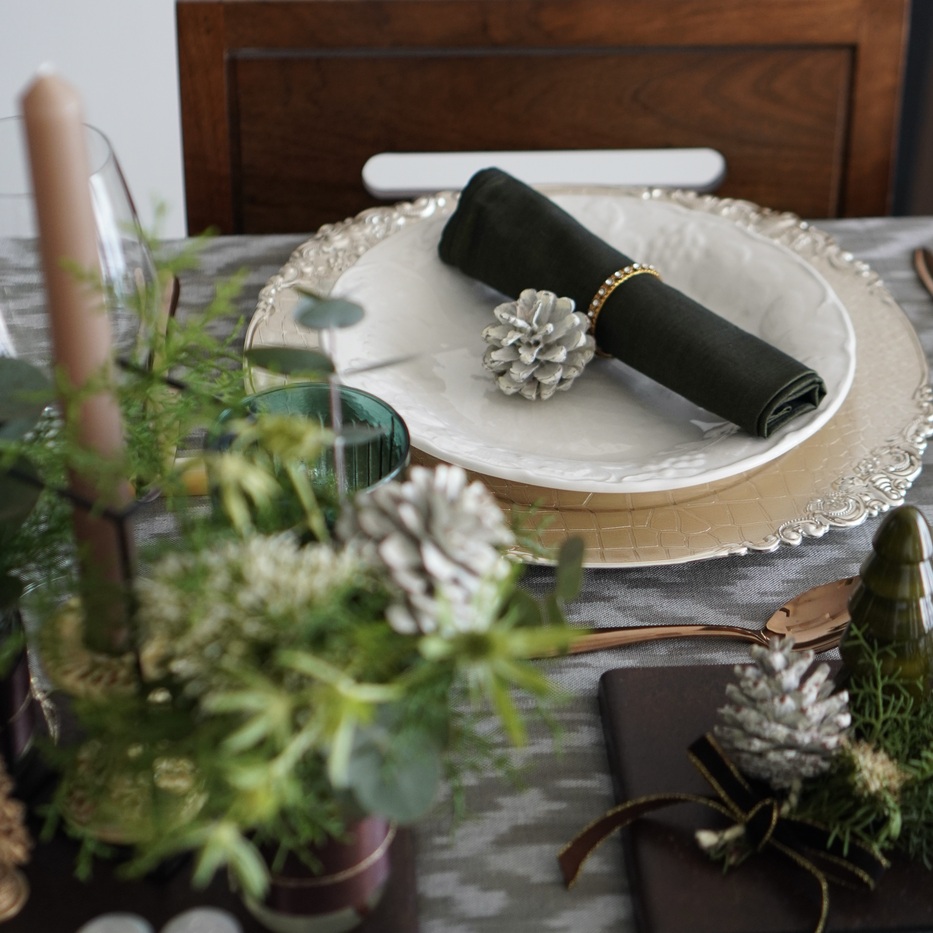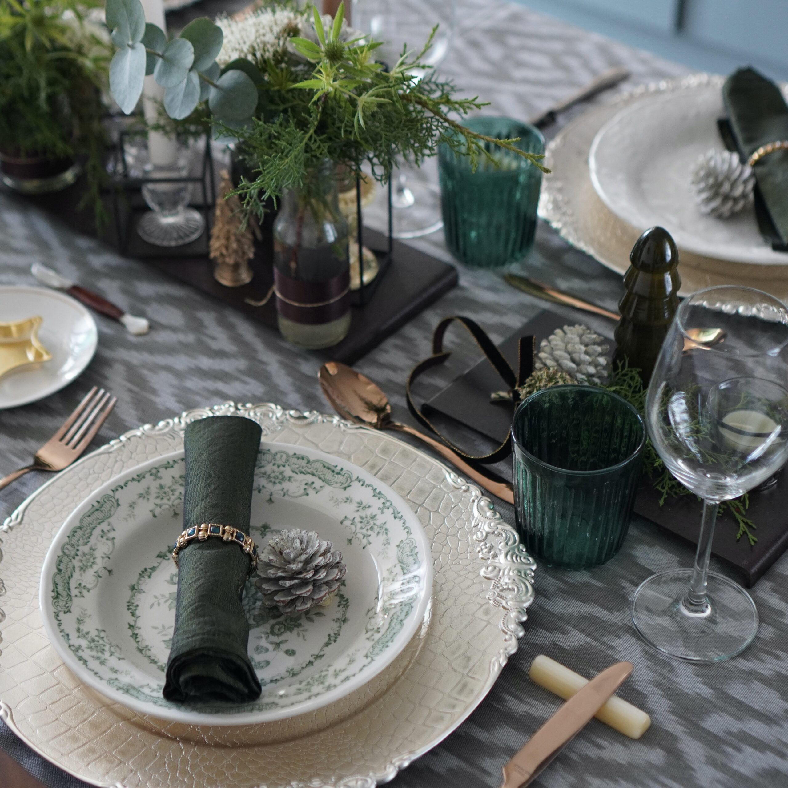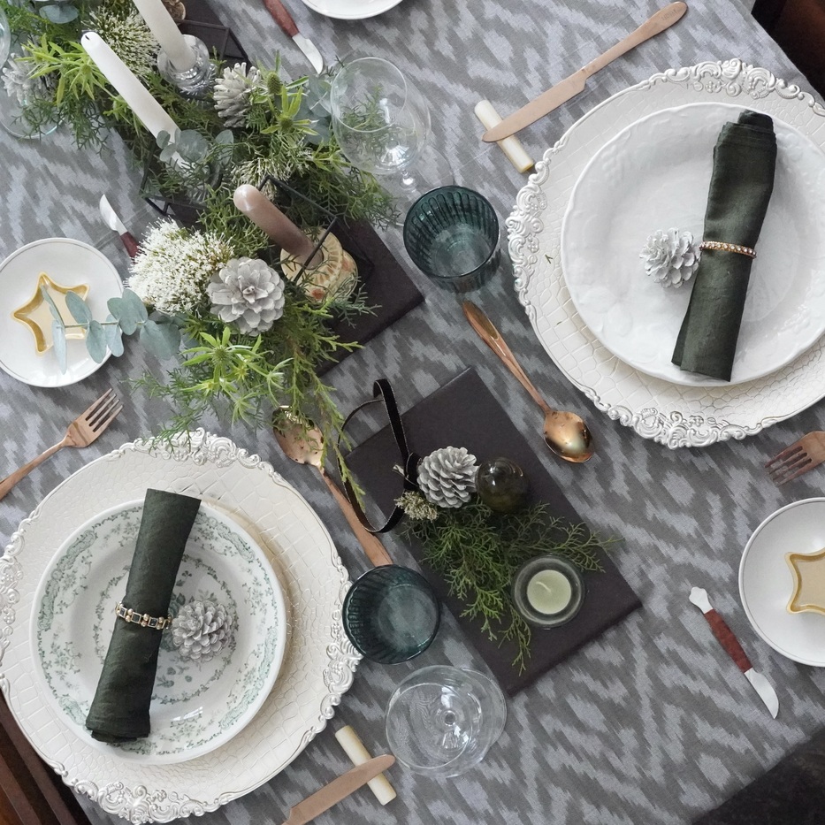今年のクリスマスのテーブルは、冬の森を思わせるようなナチュラルなグリーンでまとめています。色数をあえて絞ることで、空間に自然の凛とした空気が生まれ、過度に演出しない洗練が際立ちます。