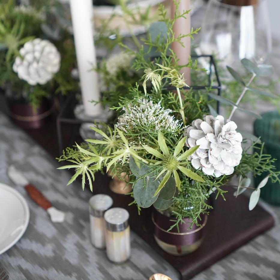 テーブルフラワーは、形の異なる空瓶にグリーンを少しずつ散らすように生け、白い松ぼっくりをアクセントにしました。自然の素材だけで構成しながらも、瓶の高さやフォルムの違いが動きを生み、軽やかなリズムが生まれます。キャンドルは鉄の枠で囲って少しモダンな印象も残し、質感をミックスすることでナチュラルすぎないナチュラルを演出しました。不揃いなガラスと植物の深い緑が調和し、控えめでありながら印象に残る大人のクリスマスらしさを添えてくれます。
