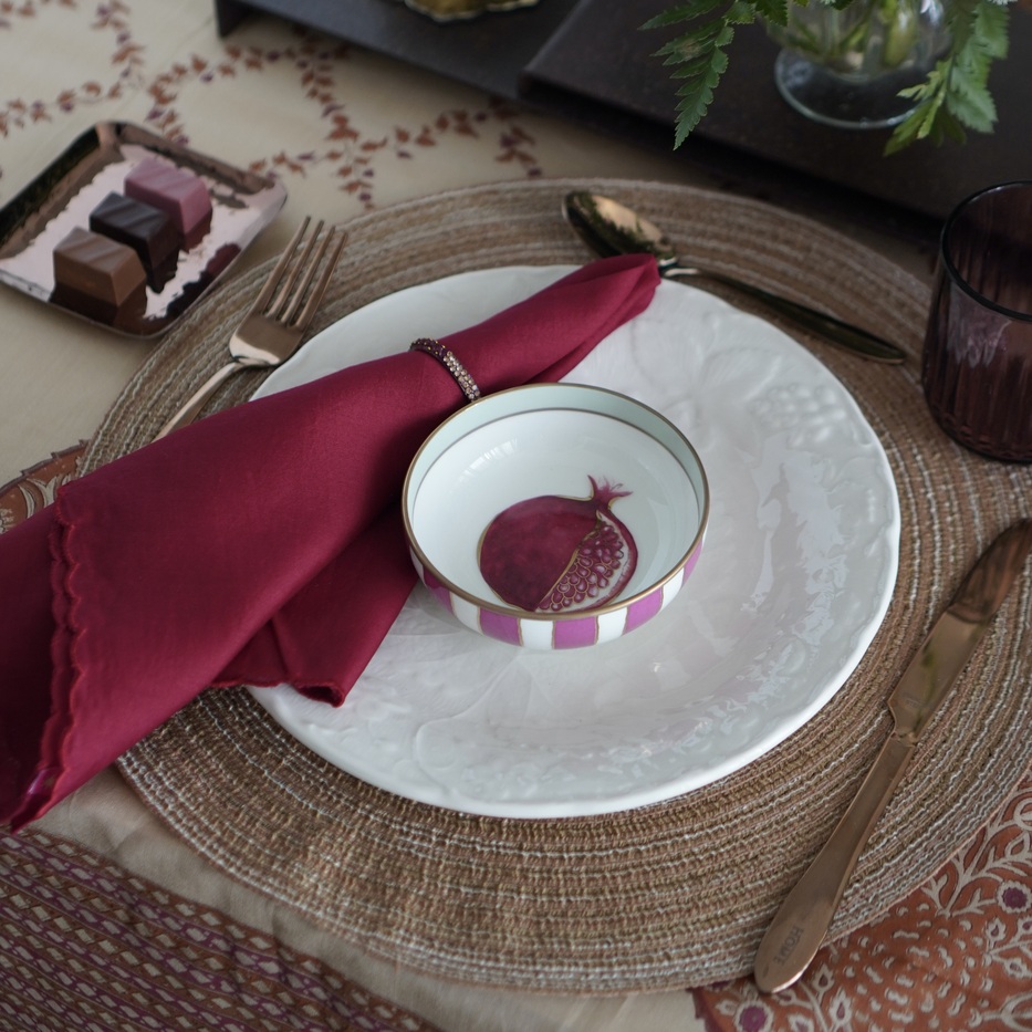 器には、ザクロの絵柄が施されたインドのカトゥリー(小鉢)を選びました。ザクロは古くから多産や豊穣、生命力の象徴とされ、国や文化を越えて「実り」の意味を持つ果実です。愛情が実を結ぶ、というバレンタインの意味合いにもぴったりです。金彩が施されたカトゥリーですが、全体をエレガントに寄せすぎないよう、器はあえてテイストをミックスしました。