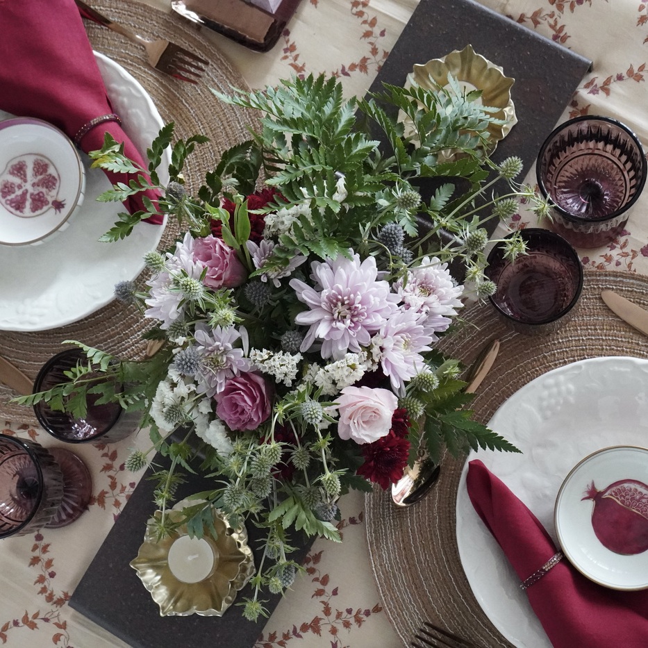 クロスは実はシルクコットン素材で、上品な金彩が施されたものです。それに合わせて、カトラリーにも金色を選び、ザクロの文様が描かれたカトゥリーの金彩とのつながりを意識しています。一方で、プレイスマットはコットンのカジュアルなものを、プレートやグラス類もあえて少しぼってりとした印象のものをセレクトしました。要素を揃えすぎないことで、全体がエレガントに傾きすぎるのを防ぎ、家庭の食卓らしい温度が生まれます。肩の力を抜いて過ごせる、気負わない心地よさへとつながるしつらえです。