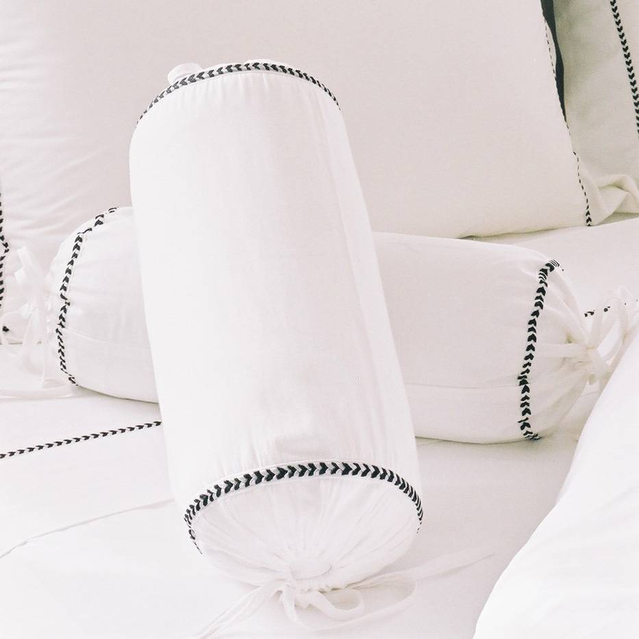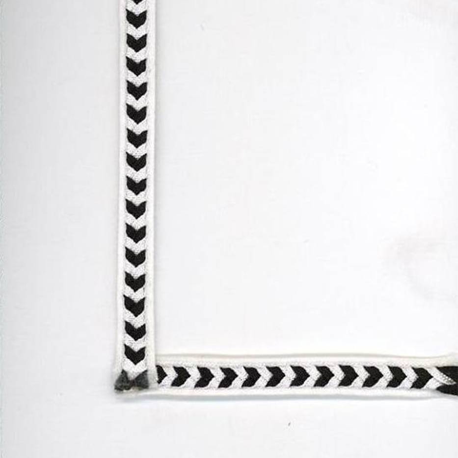 しなやかなコットン地に黒と白の網目模様のデコレーションテープを施しました。ピュアホワイトに直線で入るエレガントな黒のラインが、シンプルでありながらシャープなモダンさを演出します。ミニマムで洗練されたデザインはお部屋のタイプを選ばずお使いいただけます。