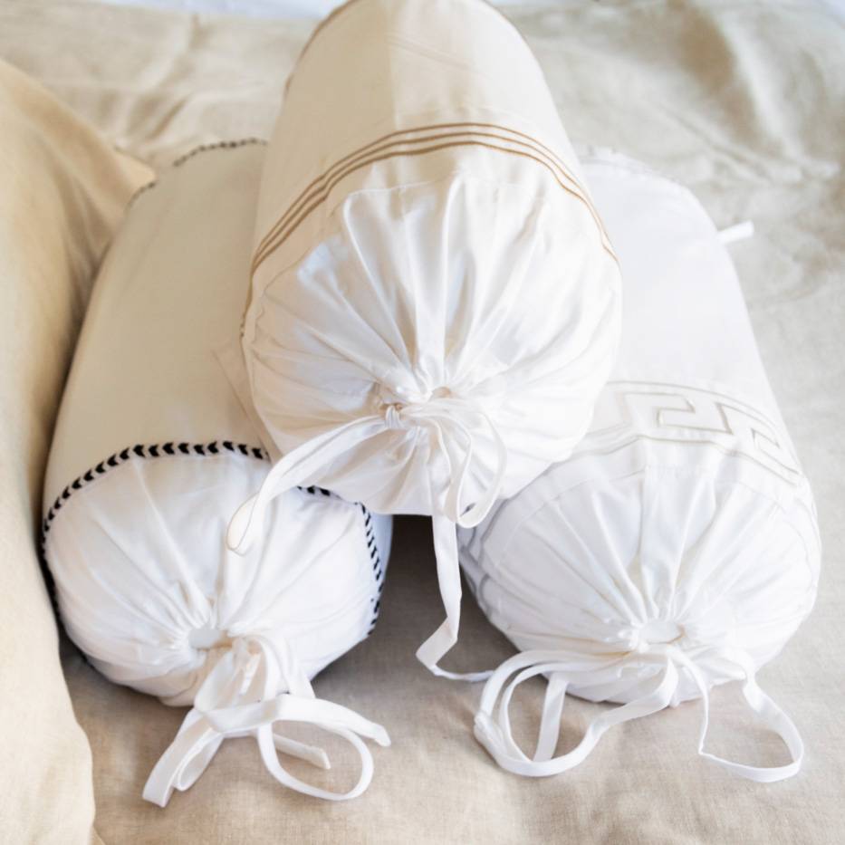 2つ重ねの枕に、さらにあると便利なのは円柱型のネックロールピロー。実は枕の役割は頭を載せるためというよりは、首の隙間を埋めるのが主な目的なのです。2つの薄さの異なる枕とネックロールピローがあれば完璧な状態で眠ることができます。