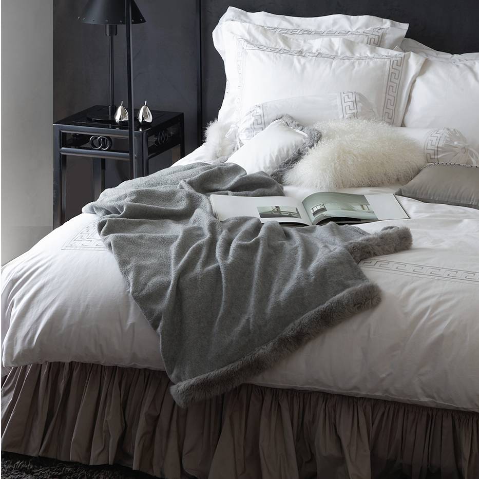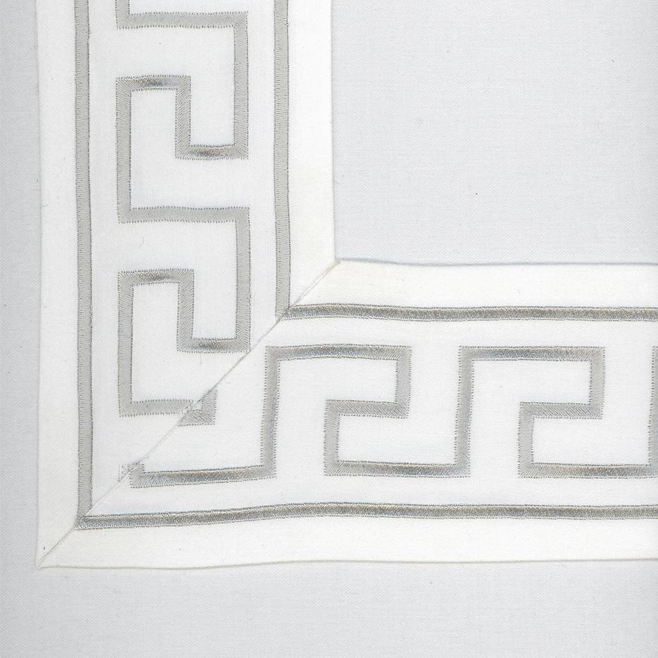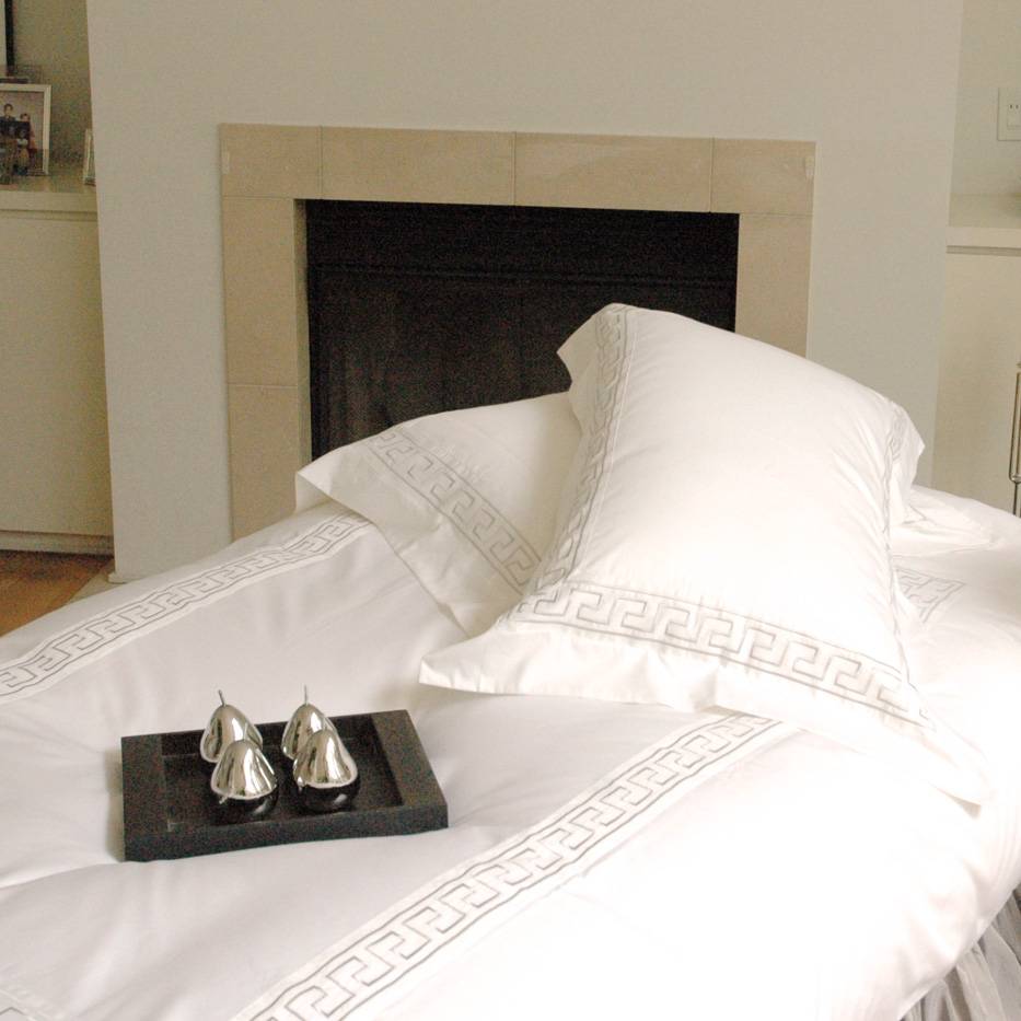 シルバーグレーの糸でシックなグリークキーモチーフの刺繍を施しています。オリエンタルな雰囲気も漂わせつつ、精度の高いモダンな刺繍が品格を感じさせるデザイン。優雅さの中にもキリリとした気品をかもし出します。一見コーディネートの難易度が高そうなグリークキーモチーフですが、端正なシルバーグレーの刺繍なら主張しすぎないアクセントとしてベッドルームを演出してくれます。なんど洗濯しても刺繍がよれたり、色落ちしたりしない使い勝手の良さも魅力です。