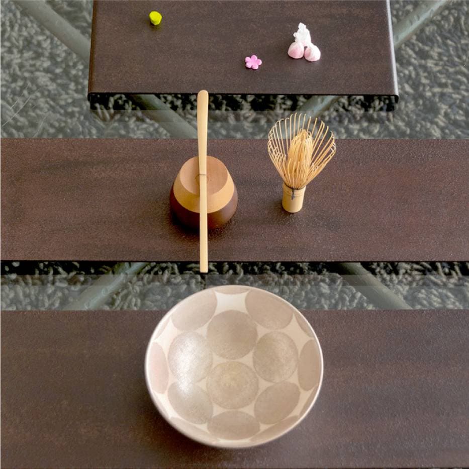 現代のマンションやモダン生活様式の中に和の物をそのままいれると、すこしちぐはぐな雰囲気になるときがありますが、錆鉄台座は和の物を上手に活かすのがとても得意です。例えばお抹茶を立てる時、リビングやダイニングテーブルの上に錆鉄台座を置くとあっという間にそこが凛とした立礼の場になります。茶筅と抹茶があれば、気軽にお抹茶をいただけます。コーヒーや紅茶をいれるより実は手軽でお客様にも大変好評な錆鉄台座を使った立礼のおもてなしです。