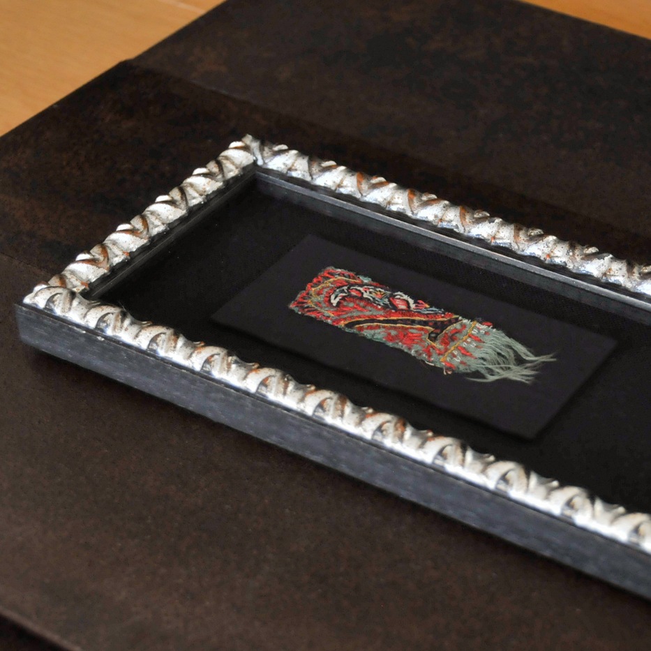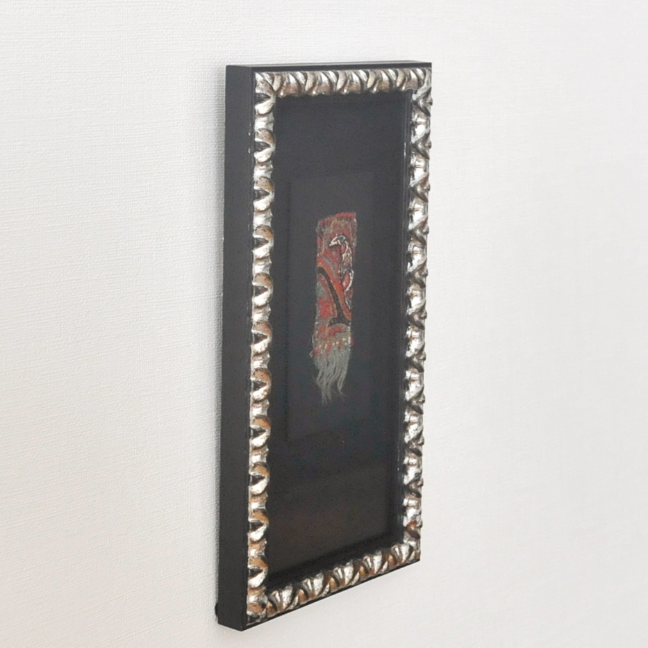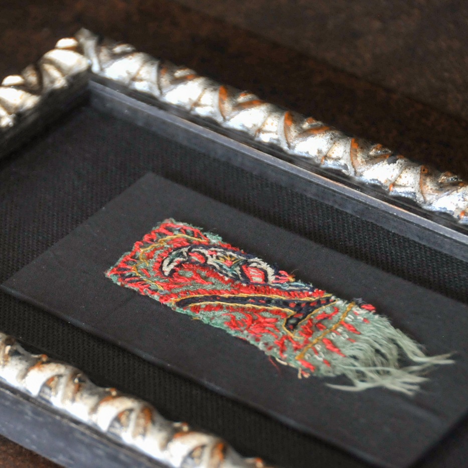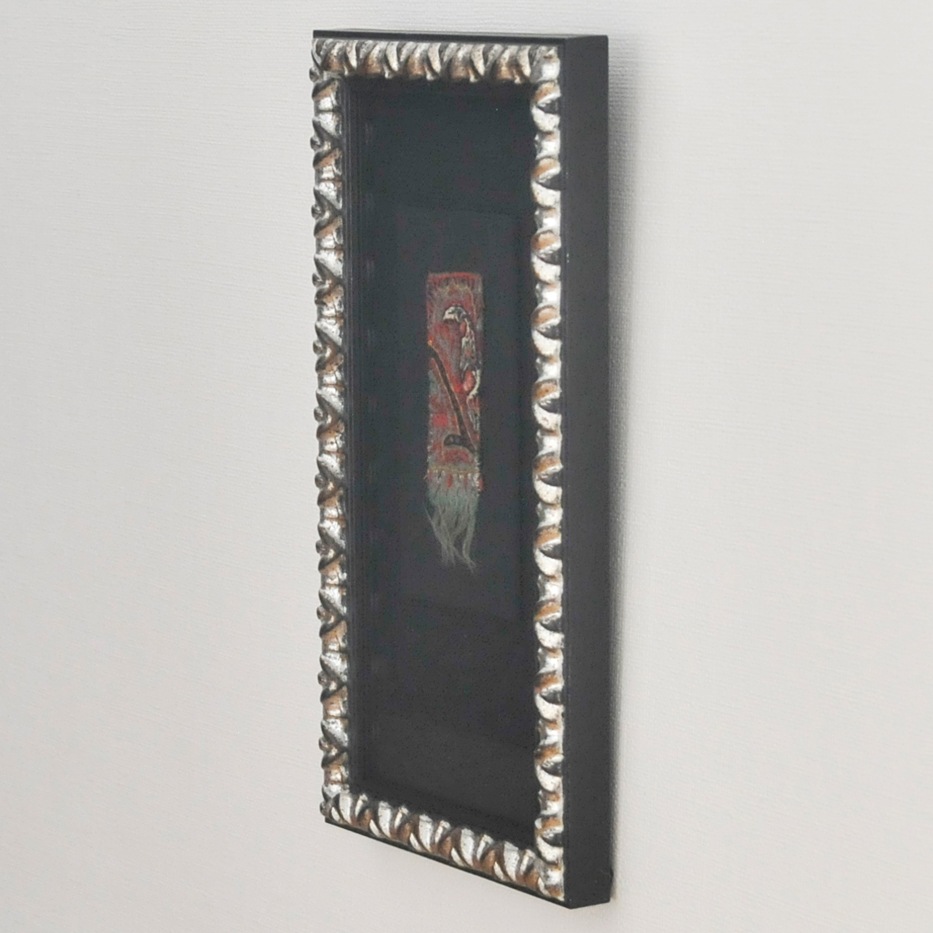 コレクター所蔵の、200年前のペーズリー刺繍のパッチワーク生地を1つ1つ丁寧にほどき、黒とシルバーのモダンな額に合わせて、小さなアート作品を創りました。