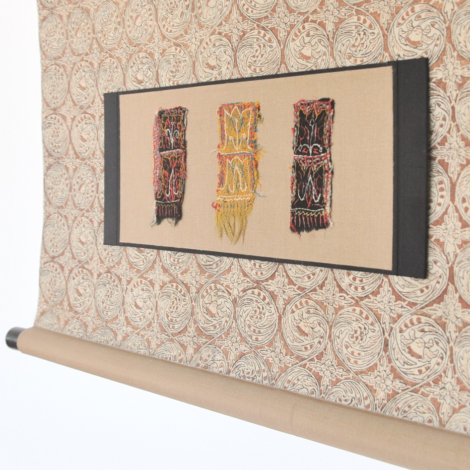 コレクター所蔵の、200年前のペーズリー刺繍のパッチワーク生地を1つ1つ丁寧にほどき、モダンな掛け軸に合わせて、小さなアート作品を創りました。