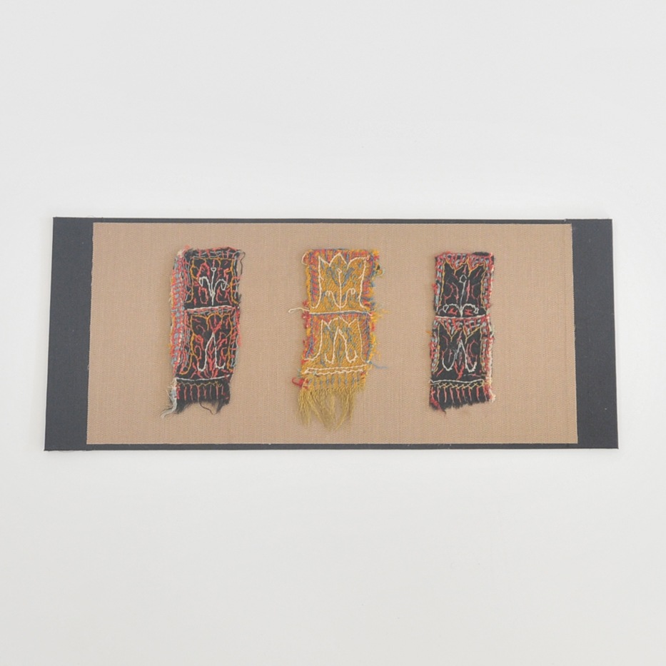 表装裂は江戸時代の京更紗。 黒い細い糸を渡してあり、そこに3枚の刺繍布がとめられた色紙状のを挟み込むように飾る仕組みになっています。 -