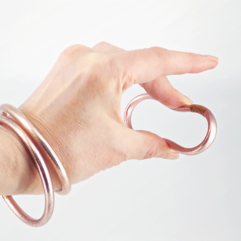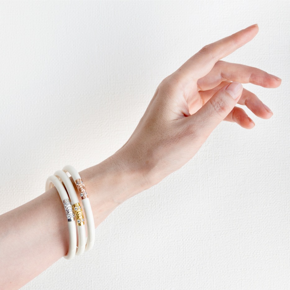 マインドフルネス習慣のために、朝起きたときから夜寝るまであらゆるシーンに使っていただきたいので、つけ心地にはとことんこだわりました。Always Bangle(オールウェイズバングル)は医療用にも使われる柔らかいメディカル・グレードチューブ素材でできています見た目のゴージャスさからは想像できないくらいとにかく「軽い」!そして大きなアクセサリーにありがちな動く度にバングルが腕を上下して気になったり、PCの作業中に邪魔になったり、ヨガの最中にガチャガチャとした音がきになることもありません。軽く、柔らかく、引っ掛かりのない滑かな素材で、つけていることが全く気にならない「ストレスフリー」なバングルです。金属アレルギーの方にもおすすめです。
