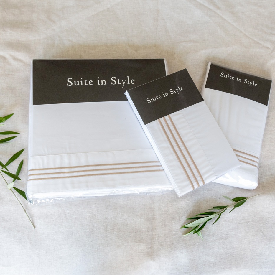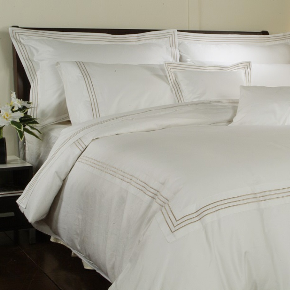 目に優しい白のコットンサテン地にゴールドベージュの3本ラインの刺繍が入っています。シンプルでありながらエレガントな調和のとれた美しさが魅力。直線の刺繍は、実は複雑な刺繍よりも一段と高い技術が問われるアイテムで、3本の直線の刺繍が均一な幅で仕上がるためには匠の技が使われています。外国のホテルのようなベッドメイキングに仕上がります。